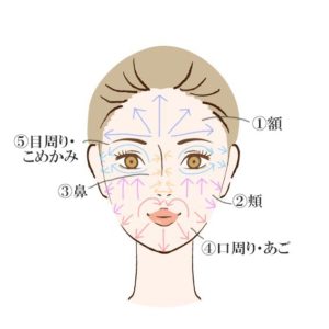 ④口周り・あご:口周りは、口角から引き上げるように・あごは、下へ流すように