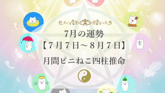 四柱推命7月(7月7日~8月7日)の運勢ー読むだけで強運になる!月間ビニねこ四柱推命 7月は「辛未」の月。 辛は、清らかで忍耐強い金の星。 未は、穏やかで人情に厚い火の星。 清らかな強さ×火のエネルギーに包まれる、1ヶ月となります。 今月は、自分の芯をぶらさずに、負けず嫌い精神で進んでいくことがテーマ。 プライドをしっか...2019.07.06四柱推命