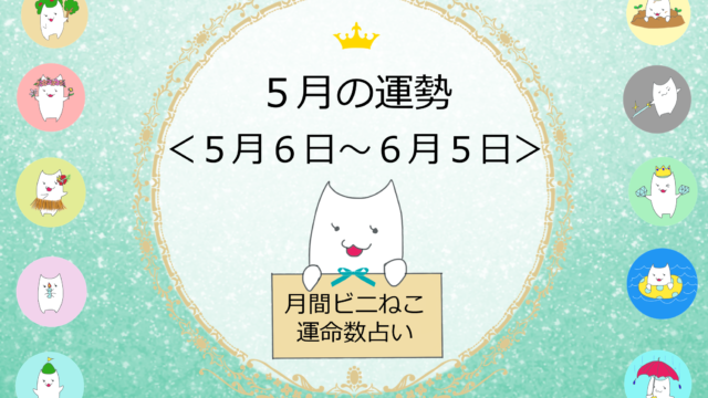 週間占い5月20日(月)~5月26日(日)の運勢ー読むだけで開運していく!週間ビ二ねこ占い 今週は、あなたにとってどんな1週間? 全10タイプ、それぞれの週間運勢をお知らせします。 読むだけで、なんだか気持ちが緩み、エネルギーアップ! あなたは何タイプ?自分の運命数を知りたい方は、まずはこちらの表でチェック↓ ...2019.05.19週間占い